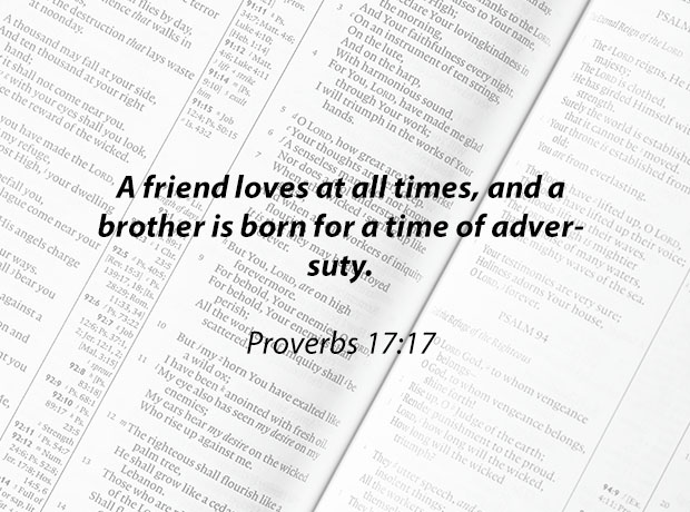 A friend loves at all times, and a brother is born for a time of adversuty. Proverbs 17:17